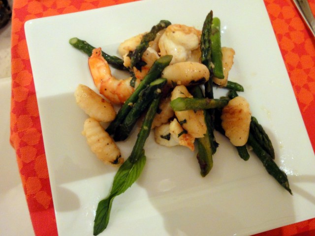 Step 5 – Stir-Fry: In a fry pan or wok, heat the olive oil and add the prawns when the oil is hot. Quickly sear the prawn for 2 minutes and add the asparagus, gnocchi and a touch of olive oil. Cook for another 2 minutes until a slight brown crust forms on the gnocchi. Add 4 more finely chopped sage or spearmint leaves, lemon juice, salt & pepper.