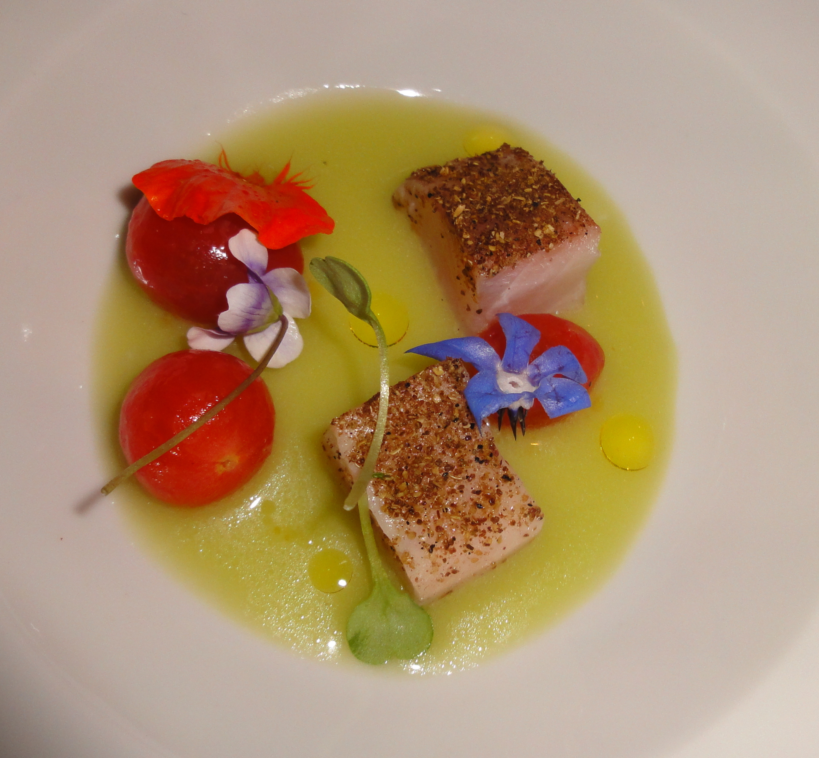 The poached Hiramasa kingfish with sansho pepper, green tomato and lemon verbena looked more exciting than it tasted. Of all dishes, it impressed me the least. Not that it wasn’t tasty, but it didn’t have the oomph of the other dishes.
