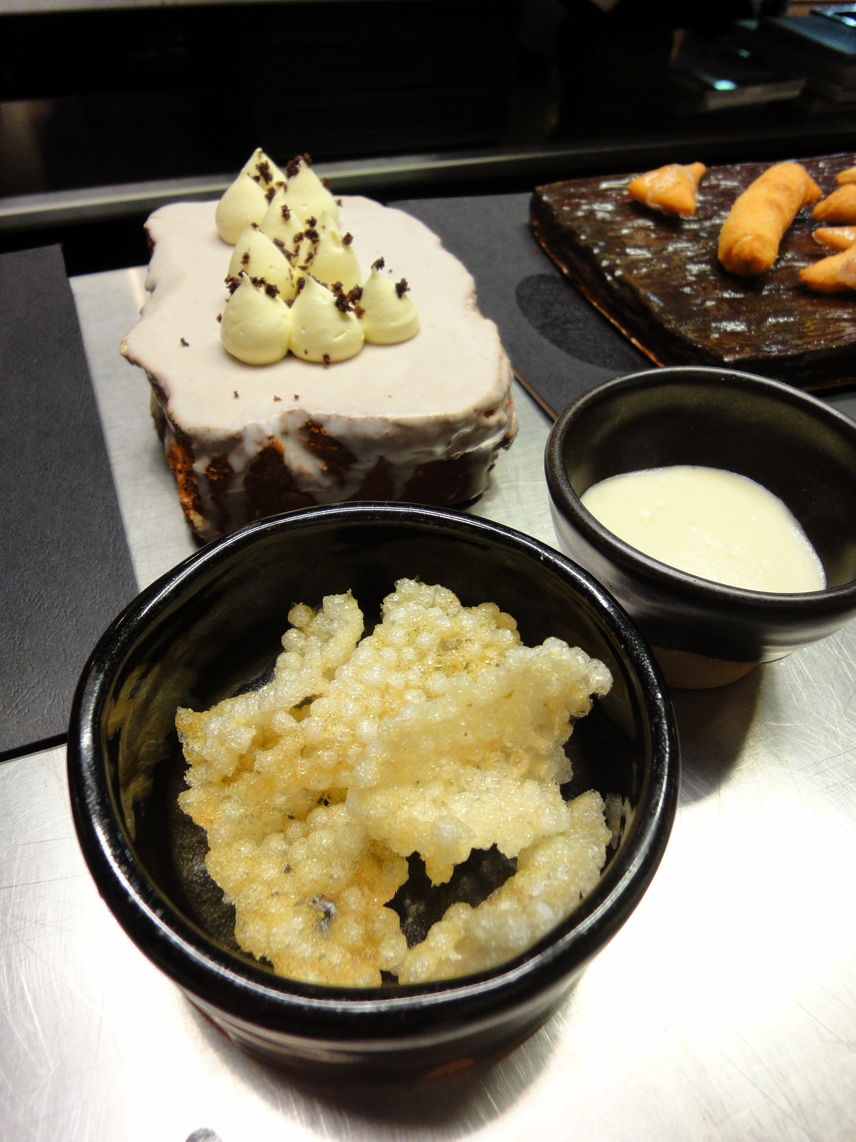 Petits fours (clockwise): Fried sourdough with lardo, fried tapioca crackers and whipped smoked butter with black olive.