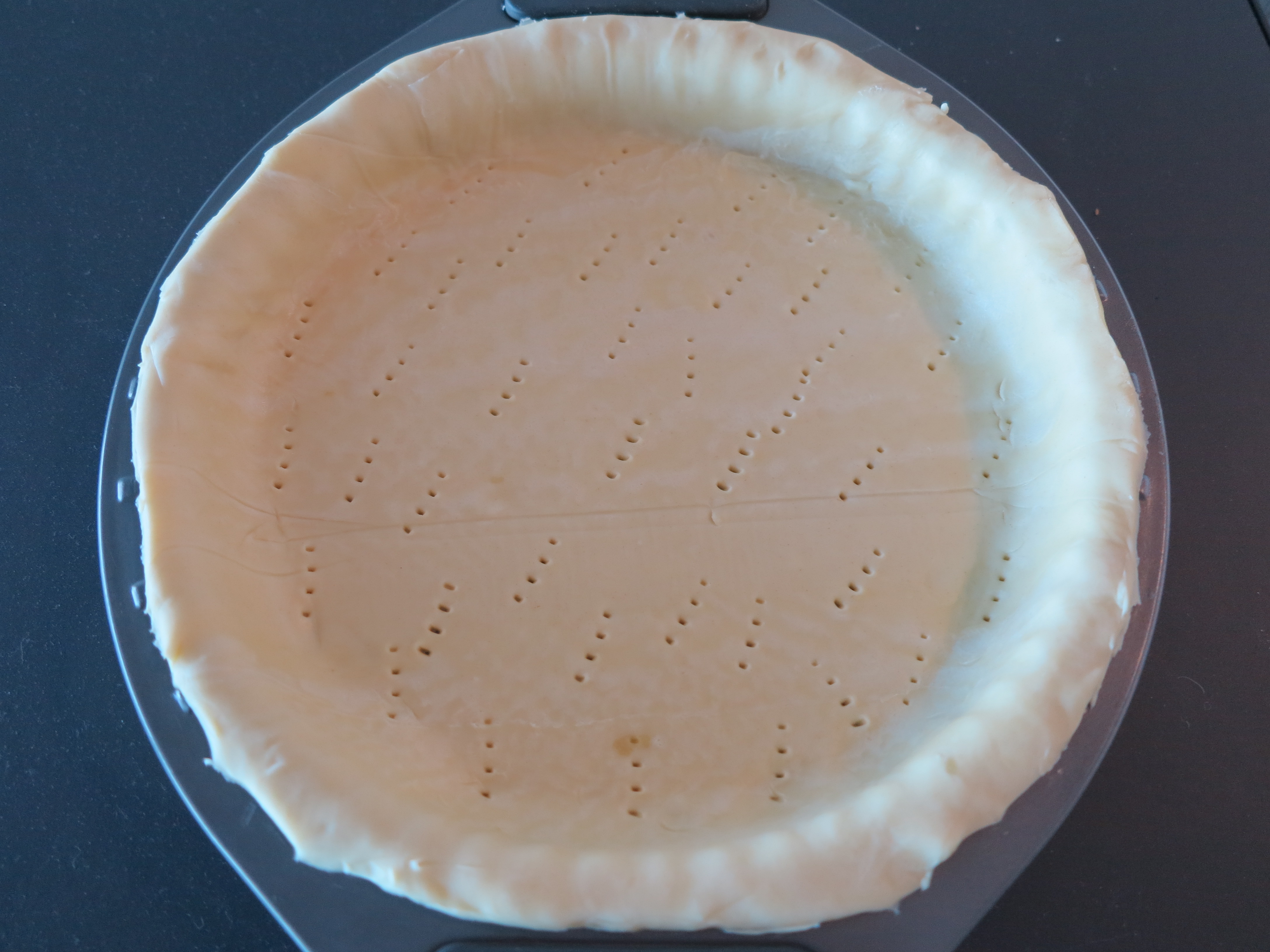 Step 1 – Prepare the tart shell: Pre-heat the oven to 200 degrees. Once defrosted, roll-out the pastry so it fits the pan. Rub a 22cm tart pan* with butter and lay the pastry down into the pan. Cut the pastry to the shape of the mold leaving about 1cm on every side as the pastry will shrink. Using a fork, poke holes throughout the whole surface of the pastry. This is called “pricking” and it will prevent the pastry from bubbling.