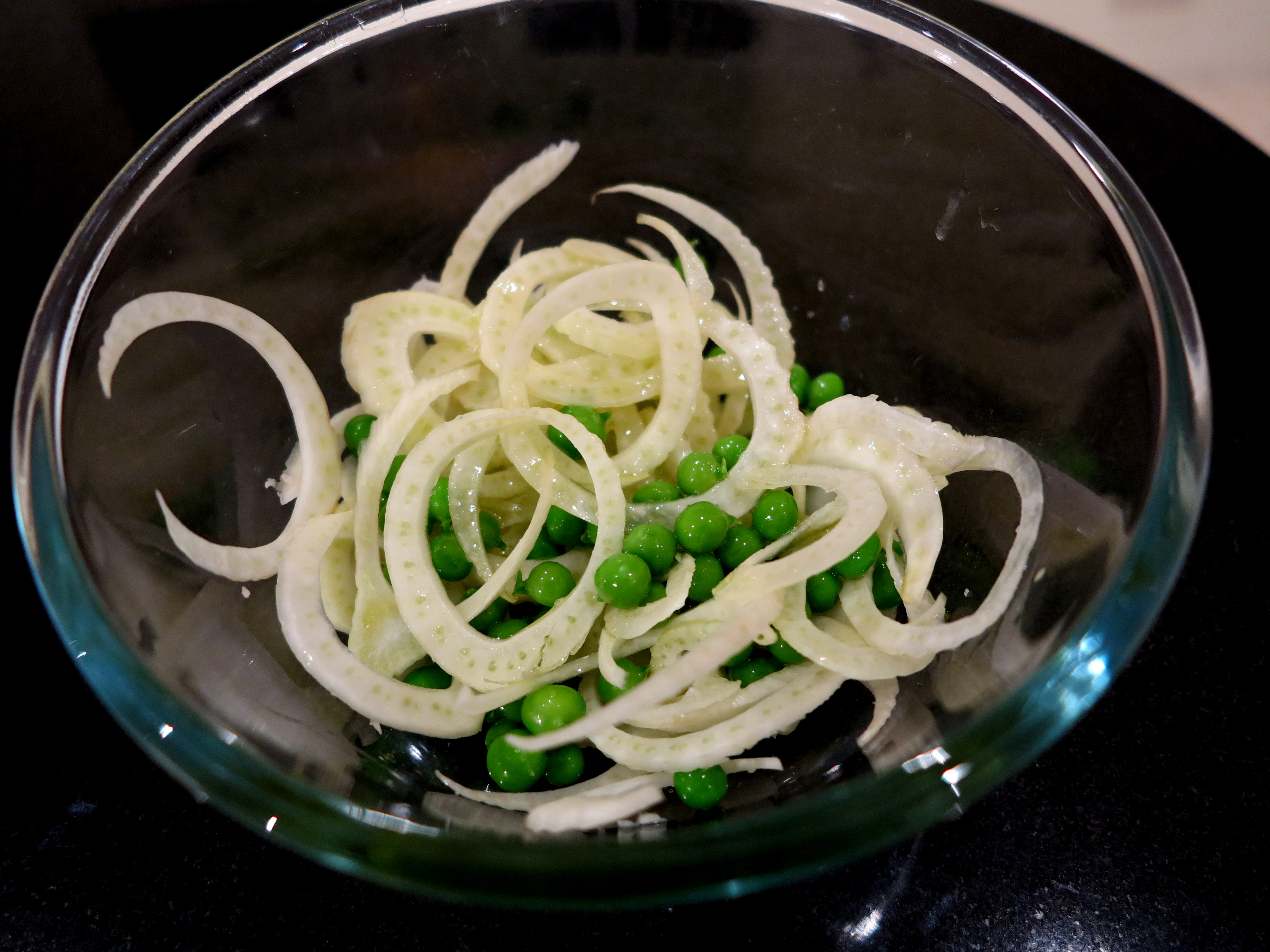 Step 4 – Prepare the Fennel & Peas Salad: Wash the fennel bulbs, cut off the hard bottom and the leafy top. Slice the fennel thinly. Then pod the peas and cook them in boiling water for a couple of minutes. Drain the peas and immediately transfer them into a cold water bath. Add them to the fennel salad. Season with 1 tbsp of olive oil, 2 tsp of lemon juice and cracked salt.
