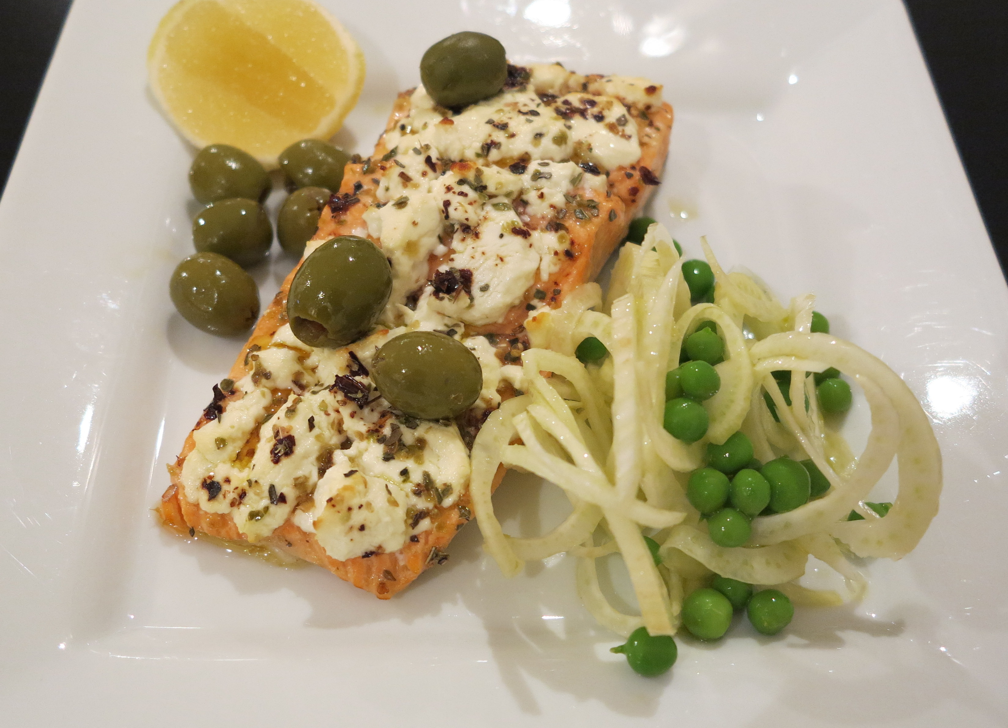 Baked Ocean Trout with Goat Cheese, Fennel & Pea Salad